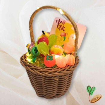 物料:迷你仿真樹脂籐花果籃、仿真生果/蔬菜、LED小燈串、乾燥花泥、透明包裝紙