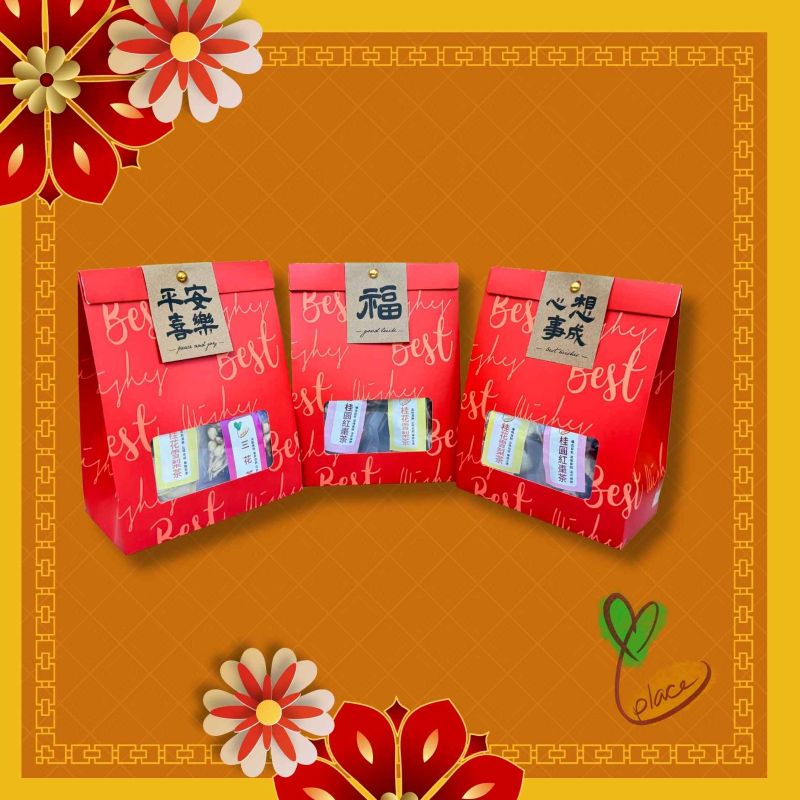 精美祝福語養生花茶包,內含滋潤雪梨桂花茶、滋補養顏紅棗茶及消滞三花茶。